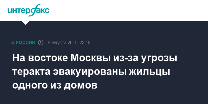 Москва. 19 августа. ИНТЕРФАКС - В Москве в Восточном административном округе из-за угрозы возможного террористического акта эвакуированы жильцы дома 16/18 по улице Щербаковская, сообщил "Интерфаксу" источник в правоохранительных органах.