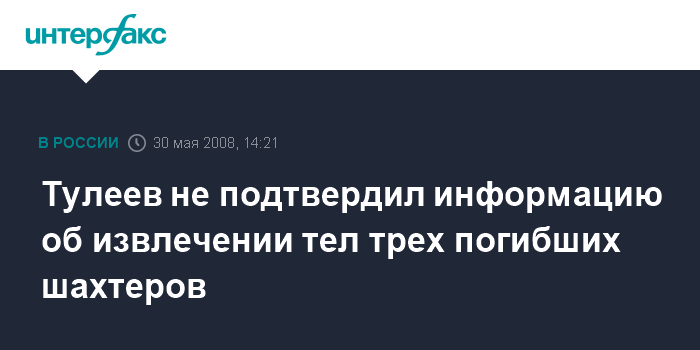 Москва. 30 мая. INTERFAX.RU – Губернатор Кемеровской области Аман Тулеев опроверг данные о том, что из под завалов шахты им. Ленина извлекли троих погибших шахтеров.