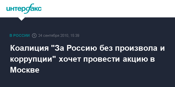 Москва. 24 сентября. INTERFAX.RU - Представители новой демократической коалиции "За Россию без произвола и коррупции" в пятницу подали в мэрию Москвы заявку на проведение 9 октября публичной акции.