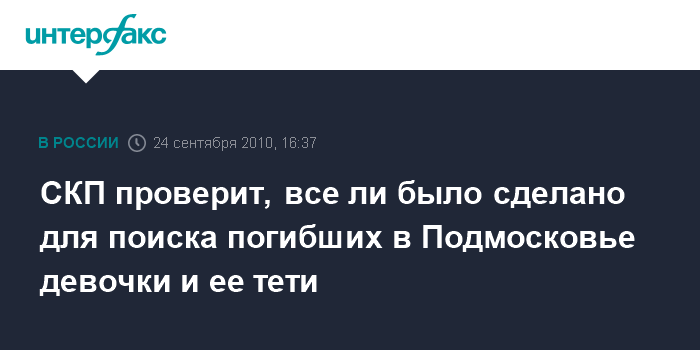 Москва. 24 сентября. INTERFAX.RU - Подмосковное управление СКП по поручению руководства ведомства проверит действия милиции по организации поисков Марии и Елизаветы Фомкиных, заблудившихся в Орехово-Зуевском районе и погибших от холода.