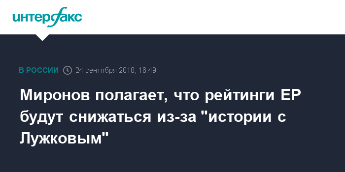 Помимо этого, Миронов заявил, что отсутствие четко выраженной позиции партии "Единая России" в связи со скандалом вокруг Лужковым негативно сказалось на рейтинге "единороссов". "Вся эта история с Лужковым и отсутствие реакции со стороны "единороссов" привела к тому, что снизился и продолжает снижаться рейтинг "Единой Росси" не только в столице, но по регионам", - отметил он, добавив, что, по его данным, "такое падение зафиксировала независимая социология".