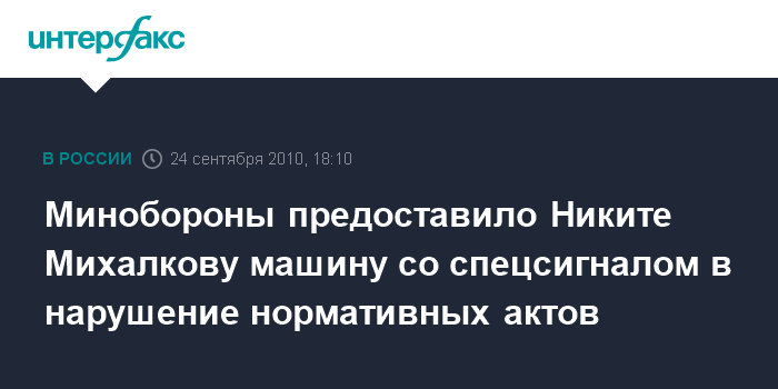 Москва. 24 сентября. INTERFAX.RU - Генпрокуратура РФ нашла нарушения в действиях министерства обороны России, предоставившего председателю Общественного совета при военном ведомстве Никите Михалкову транспортное средство с проблесковым маячком.