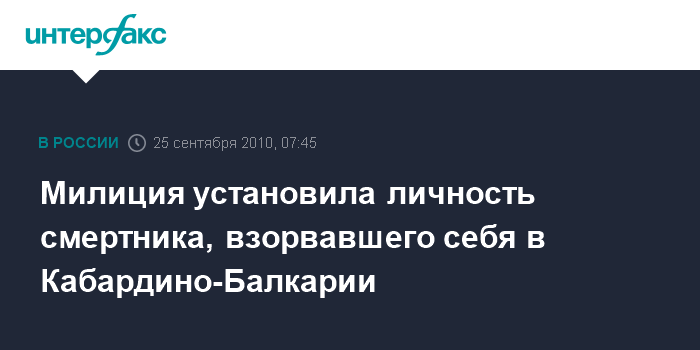 Ростов-на-Дону. 25 сентября. ИНТЕРФАКС-ЮГ - Установлена личность террориста-смертника, обстрелявшего здание отдела УФСБ, а затем подорвавшего себя у здания отдела вневедомственной охраны (ОВО) в городе Нарткала (Кабардино-Балкария).