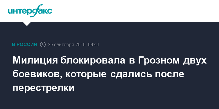 Москва. 25 сентября. ИНТЕРФАКС - Двое боевиков сдались в Грозном после перестрелки с милиционерами, сообщил "Интерфаксу" в субботу источник в правоохранительных органах.
