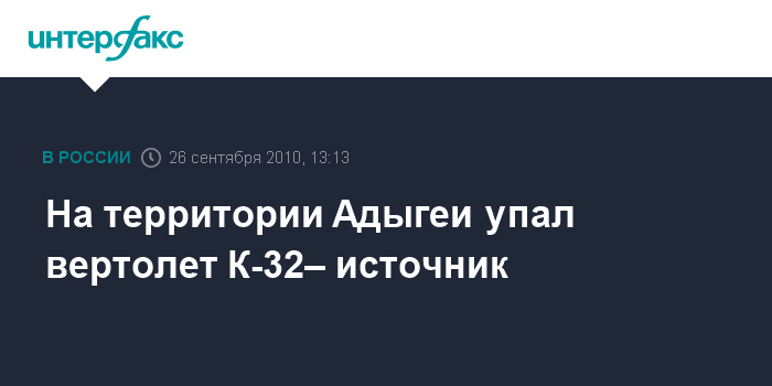 Ростов-на-Дону. 26 сентября. INTERFAX.RU - Вертолет Ка-32 потерпел катастрофу в районе горы Фиш (Адыгея), сообщили агентству "Интерфакс-Юг" в правоохранительных органах Южного федерального округа. "Авария произошло в 12:02 мск. Вертолет Ка-32, выполнявший работы, связанные с оборудованием ЛЭП, упал с высоты 30 м в районе горы Фиш", - сказал собеседник агентства. По его словам, есть пострадавшие, данные о которых устанавливаются.