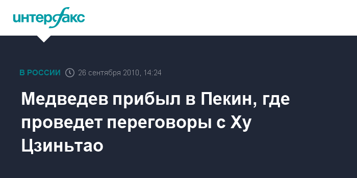 Пекин. 26 сентября. INTERFAX.RU - Президент РФ Дмитрий Медведев, находящийся с официальным визитом в Китае, прибыл в воскресенье в Пекин. В понедельник в китайской столице у него состоятся переговоры с председателем КНР Ху Цзиньтао и встречи с высшим китайским руководством - премьером госсовета Вэнь Цзябао и председателем Постоянного комитета Всекитайского собрания народных представителей У Банго. Ожидается также, что Д.Медведев и Ху Цзиньтао примут участие в церемонии запуска недавно достроенного нефтепровода "Сковородино-Дацин", по которому российская нефть пойдет в Китай со следующего года.