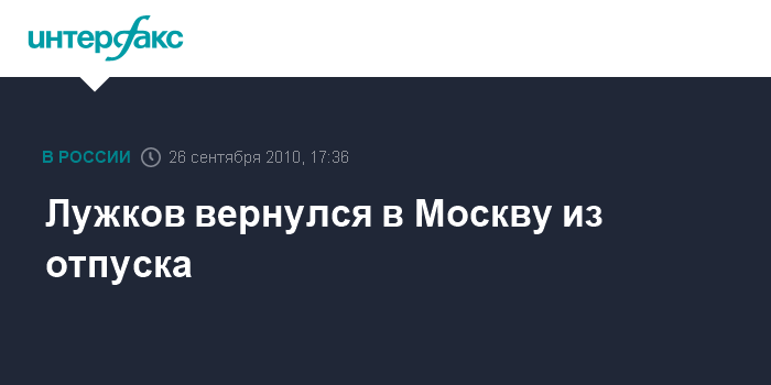 Москва. 26 сентября. INTERFAX.RU - Мэр столицы Юрий Лужков завершил свой очередной отпуск, сообщил "Интерфаксу" источник в близком окружении московского градоначальника в воскресенье. "Около получаса назад самолет, на борту которого находился Ю.Лужков, благополучно приземлился в Москве", - сказал собеседник "Интерфакса".