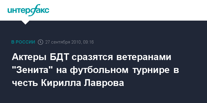 Как сообщает пресс-служба Смольного, в этом году в турнире на кубок им.К.Лаврова примут участие 10 "театральных" футбольных команд, а также игроки ФК "Зенит", ставшие чемпионами СССР в 1984 году.