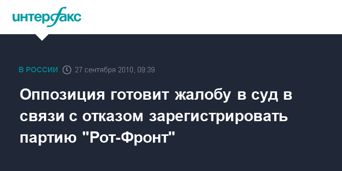 Москва. 27 сентября. INTERFAX.RU - Активисты оппозиции намерены обжаловать в суде отказ Минюста зарегистрировать партию "Российский объединенный трудовой фронт" ("Рот-Фронт").