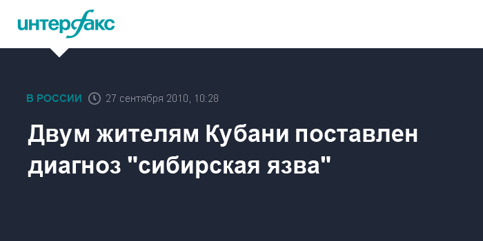 Краснодар. 27 сентября. INTERFAX.RU - У двух человек в Краснодарском крае подтвержден диагноз "сибирская язва", еще трем заболевшим диагноз будет поставлен во вторник, сообщает пресс-служба Южного регионального центра МЧС РФ.