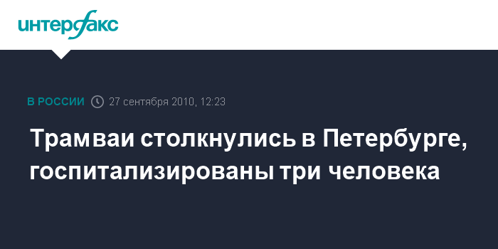 Санкт-Петербург. 27 сентября. INTERFAX.RU - В Петербурге в понедельник днем столкнулись два трамвая, сообщили "Интерфаксу" в Главном управлении МЧС по северной столице.