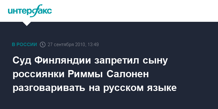 Хельсинки, 27 сентября. INTERFAX.RU - Административный суд финского города Турку (Turku) принял решение запретить россиянке Римме Салонен разговаривать во время встреч с семилетним сыном Антоном на русском языке.