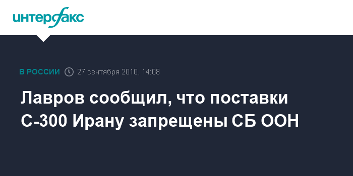 Пекин. 27 сентября. INTERFAX.RU - Поставка российских комплексов С-300 Ирану подпадает под санкции СБ ООН, в этом случае в силу вступает форс-мажор, заявил глава МИД РФ Сергей Лавров.