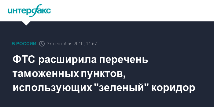 Москва. 27 сентября. INTERFAX.RU - Федеральная таможенная служба РФ расширила перечень пунктов, при таможенном оформлении в которых используется так называемый "зеленый" коридор.