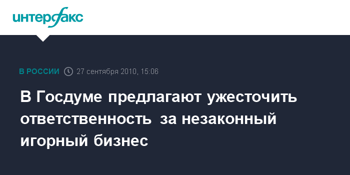Москва. 27 сентября. INTERFAX.RU - Депутаты Госдумы предлагают рассматривать незаконную деятельность в сфере азартных игр не как экономическое преступление, а как преступление, создающее серьезную угрозу основам общественной нравственности.