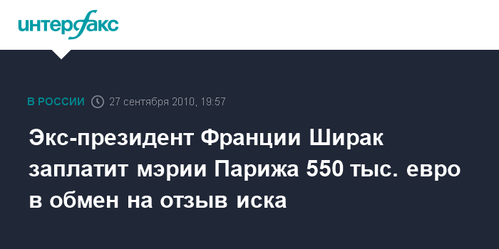 Экс-президент Франции Ширак заплатит мэрии Парижа 550 тыс. евро в обмен на отзыв иска