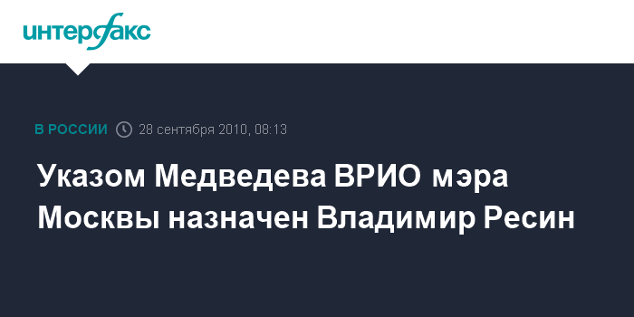Москва. 28 сентября. INTERFAX.RU - Президент России Дмитрий Медведев указом назначил Владимира Ресина временно исполняющим обязанности мэра Москвы, сообщает пресс-служба Кремля.