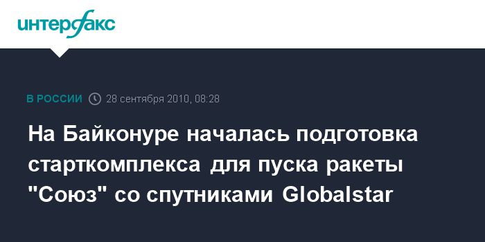 Байконур. 28 сентября. INTERFAX.RU - На площадке N31 Байконура расчеты космического центра "Южный" приступили к работам по подготовке стартового комплекса к запуску ракеты космического назначения "Союз-2-1А" с разгонным блоком "Фрегат" и шестью спутниками низкоорбитальной связи Globalstar, сообщил агентству "Интерфакс" во вторник источник на космодроме.