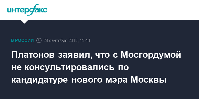 Москва. 28 сентября. INTERFAX.RU - Консультации по возможным кандидатурам нового мэра российской столицы с депутатами Мосгордумы не проводились, заявил спикер Мосгордумы Владимир Платонов.