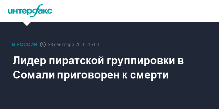 Лондон. 28 сентября. INTERFAX.RU - Руководитель группы сомалийских пиратов Салах Мохаммед Гелле приговорен судом Пунтленда, полуавтономного образования на территории Сомали, к смертной казни за убийство капитана захваченного судна, передает во вторник британская телерадиокорпорация Би-би-си.