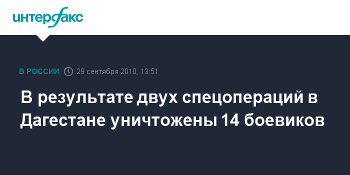 Москва. 29 сентября. INTERFAX.RU - По последним данным, 14 боевиков уничтожены в результате двух специальных операций в Дагестане, сообщили "Интерфаксу" в Национальном антитеррористическом комитете.