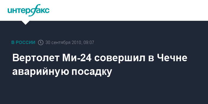 Москва. 30 сентября. INTERFAX.RU - На юге Чечни совершил аварийную посадку вертолет Ми-24 Внутренних войск МВД России, пострадавших нет, сообщил "Интерфаксу" источник в правоохранительных органах.