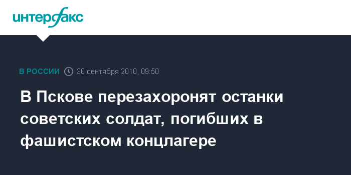 Псков. 30 сентября. INTERFAX.RU - В Пскове предадут земле останки 295 советских воинов, погибших в концлагере "Шталаг-372" на территории города во время Великой Отечественной войны, сообщили "Интерфаксу" в пресс-службе городской администрации.