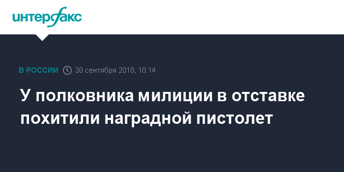 Москва. 30 сентября. INTERFAX.RU - В среду утром в центре столицы у пенсионера МВД, полковника милиции в отставке похитили наградной пистолет, сообщил "Интерфаксу" источник в правоохранительных органах города.