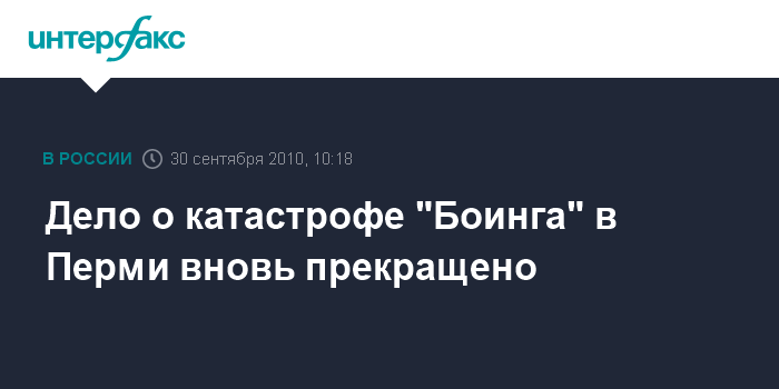 Москва. 30 сентября. INTERFAX.RU - Дело о катастрофе в Перми самолета "Боинг-737", в результате которой в 2008 году погибли 88 человек, вновь прекращено, сообщил "Интерфаксу" адвокат потерпевших Игорь Трунов.