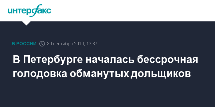 Санкт-Петербург. 30 сентября. INTERFAX.RU - Обманутые дольщики жилого дома на проспекте Пятилеток, 13 в Петербурге в четверг начали голодовку.