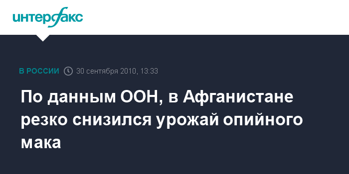 Лондон. 30 сентября. INTERFAX.RU - Самый низкий за последние семь лет урожай опийного мака зарегистрирован в этом году в Афганистане, сообщило Управление ООН по наркотикам и преступности (УНП).