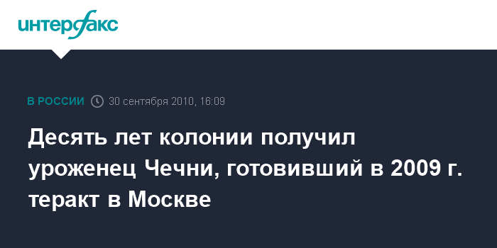 Москва. 30 сентября. INTERFAX.RU - Мосгорсуд приговорил к десяти годам колонии строгого режима уроженца Грозного, который был признан виновным в подготовке теракта в Москве, сообщает столичная прокуратура.