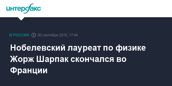 Париж. 30 сентября. INTERFAX.RU - Известный французский физик, лауреат Нобелевской премии Жорж Шарпак, скончался в Париже в возрасте 86 лет, сообщает в четверг радиостанция France Info.