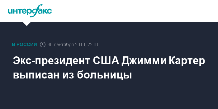 Вашингтон. 30 сентября. INTERFAX.RU - Бывший президент США Джимми Картер в четверг выписан из больницы в американском городе Кливленде, сообщает телеканал CNN.