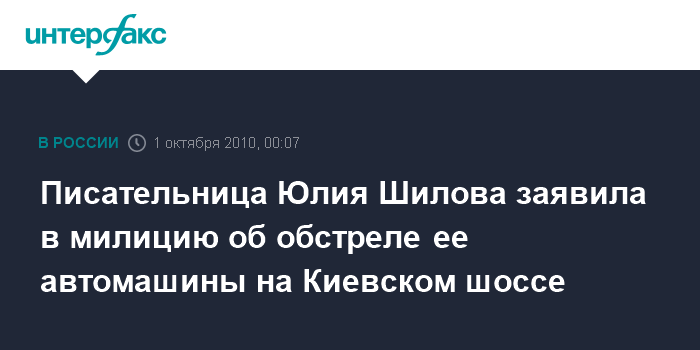 Москва. 1 октября. ИНТЕРФАКС - Автомашина писательницы Юлии Шиловой, возможно, обстреляна неизвестным в Подмосковье, сообщил "Интерфаксу" вечером в четверг источник в правоохранительных органах.