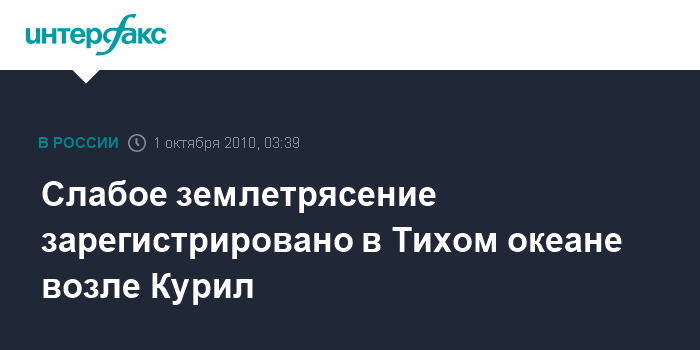Южно-Сахалинск. 1 октября. ИНТЕРФАКС-ДАЛЬНИЙ ВОСТОК - Слабое землетрясение зарегистрировано в пятницу в 6:14 по сахалинскому времени в 100 км восточнее о.Шикотан, сообщили агентству "Интерфакс-Дальний Восток" на сейсмостанции "Южно-Сахалинск".
