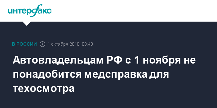 1 октября. INTERFAX.RU - Автомобилистам через месяц, как ожидается, не нужно будет предъявлять медицинскую справку при прохождении государственного технического осмотра транспортного средства.