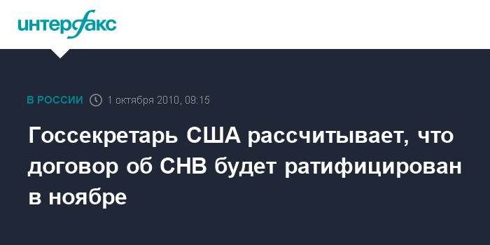 Вашингтон. 1 октября. INTERFAX.RU - Госсекретарь США Хиллари Клинтон выразила надежду на то, что российско-американский договор об СНВ будет ратифицирован после выборов в сенат в ноябре.