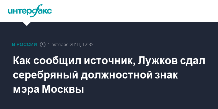 Как сообщил источник, Лужков сдал серебряный должностной знак мэра Москвы