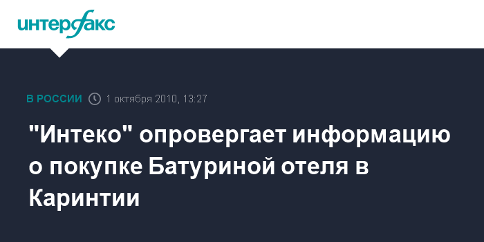 Москва. 1 октября. INTEERFAX.RU - Компания "Интеко" опровергла сообщения австрийских СМИ о том, что Елена Батурина, супруга экс-мэра Москвы Юрия Лужкова, является одним из вероятных покупателей замка-отеля в городе Фельдене (земля Каринтия).