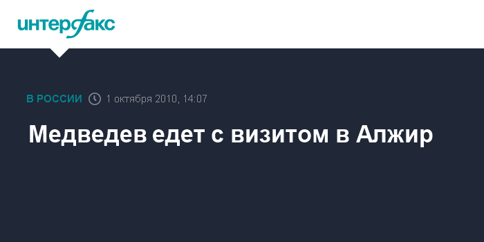 Москва. 1 октября. INTERFAX.RU - Президент России Дмитрий Медведев 6 октября посетит Алжир с официальным визитом, сообщила в пятницу пресс-служба Кремля.