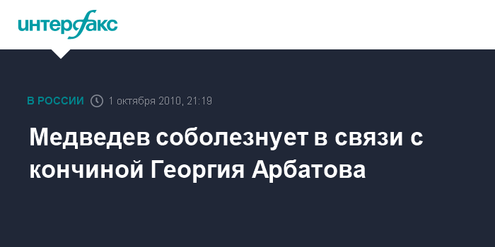 Москва. 1 октября. INTERFAX.RU- Президент России Дмитрий Медведев выразил соболезнования родным и близким академика Георгия Арбатова в связи с его кончиной, сообщила пресс-служба Кремля в пятницу.