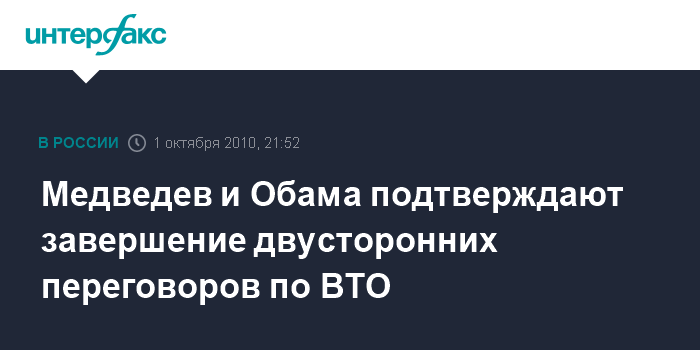 Москва. 1 октября. INTERFAX.RU - Президент РФ Дмитрий Медведев и президент США Барак Обама в телефонном разговоре в пятницу подтвердили завершение двусторонних переговоров о вступлении России в ВТО, сообщила журналистам пресс-секретарь главы российского государства Наталья Тимакова.