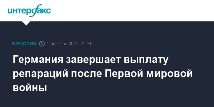 Берлин. 1 октября. ИНТЕРФАКС - В воскресенье Германия завершит выплату репараций после Первой мировой войны, сообщает в пятницу веб-сайт немецкой газеты "Райнише пост".