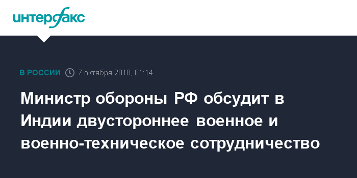 Нью-Дели. 7 октября. ИНТЕРФАКС - Министр обороны РФ Анатолий Сердюков обсудит в четверг на переговорах с представителями военного ведомства Индии вопросы развития двустороннего военного и военно-технического сотрудничества.