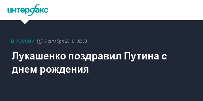 Минск. 7 октября. INTERFAX.RU - Президент Белоруссии Александр Лукашенко поздравил председателя правительства Российской Федерации Владимира Путина с днем рождения, сообщили агентству "Интерфакс" в четверг в пресс-службе главы белорусского государства.