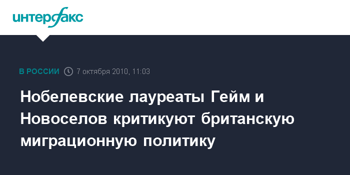 Лондон. 7 октября. INTERFAX.RU - Группа лауреатов Нобелевской премии, среди которых - работающие в Великобритании выходцы из России Андрей Гейм и Константин Новоселов, призвали британские власти внести изменения в миграционную политику, сообщают в четверг местные СМИ.