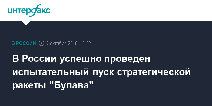 Москва. 7 октября. INTERFAX.RU - Тяжелый атомный подводный ракетный крейсер стратегического назначения "Дмитрий Донской" в четверг успешно произвел испытательный пуск межконтинентальной баллистической ракеты морского базирования "Булава", сообщили "Интерфаксу" в Управлении пресс-службы и информации Минобороны РФ.