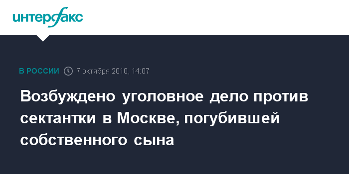 Москва. 7 октября. INTERFAX.RU - Столичные органы Следственного комитета России возбудили уголовное дело по ст. 125 УК РФ (оставление в опасности) в отношении женщины-члена секты, действия которой привели к гибели ее сына, сообщил официальный представитель управления СКР по Москве Сергей Марченко.