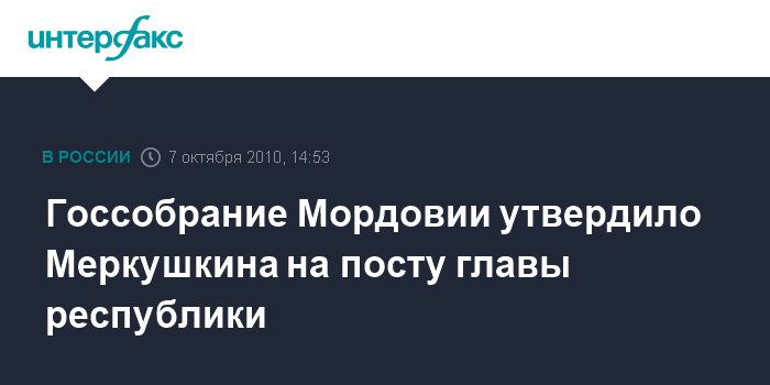 Саранск. 7 октября. INTERFAX.RU - Депутаты Государственного собрания Мордовии на заседании в четверг наделили Николая Меркушкина полномочиями главы республики, сообщили агентству "Интерфакс" в пресс-службе главы республики.